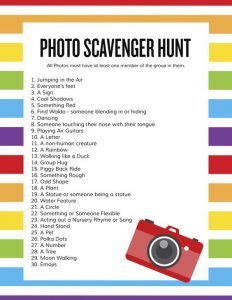 How about a Photo Scavenger hunt? Use some lists (here is one form Pinterest) or create your own. Each family can have a different list or work off same one. If the weather is crummy, take it inside for silly poses or items around the house.