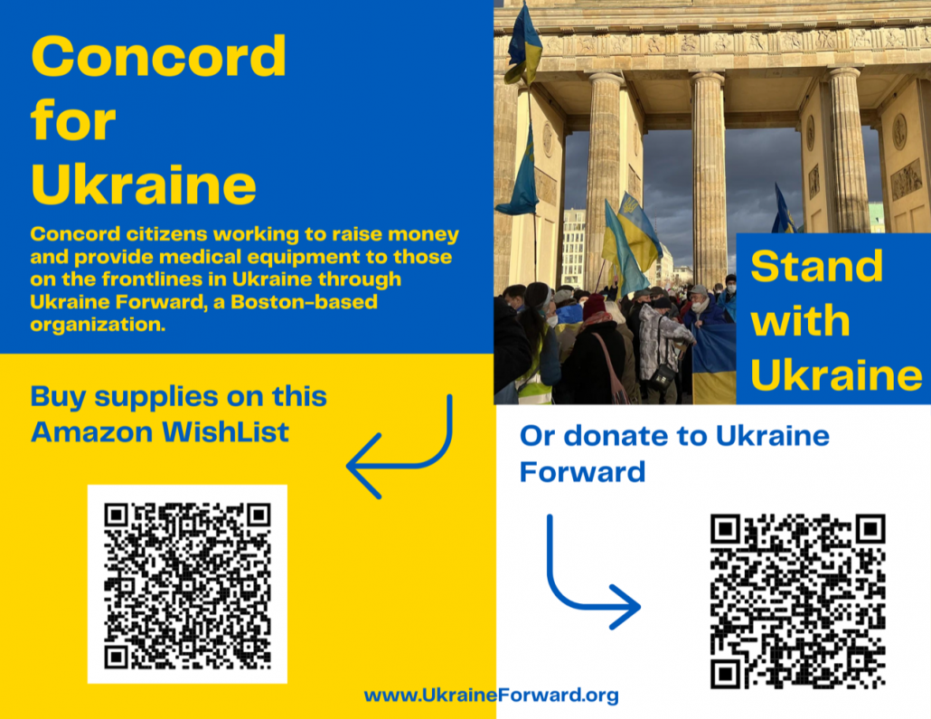Concord for Ukraine is a group of concerned Concord citizens who have come together to raise money and provide medical equipment to those on the frontlines in Ukraine through a Boston-based organization called Ukraine Forward.