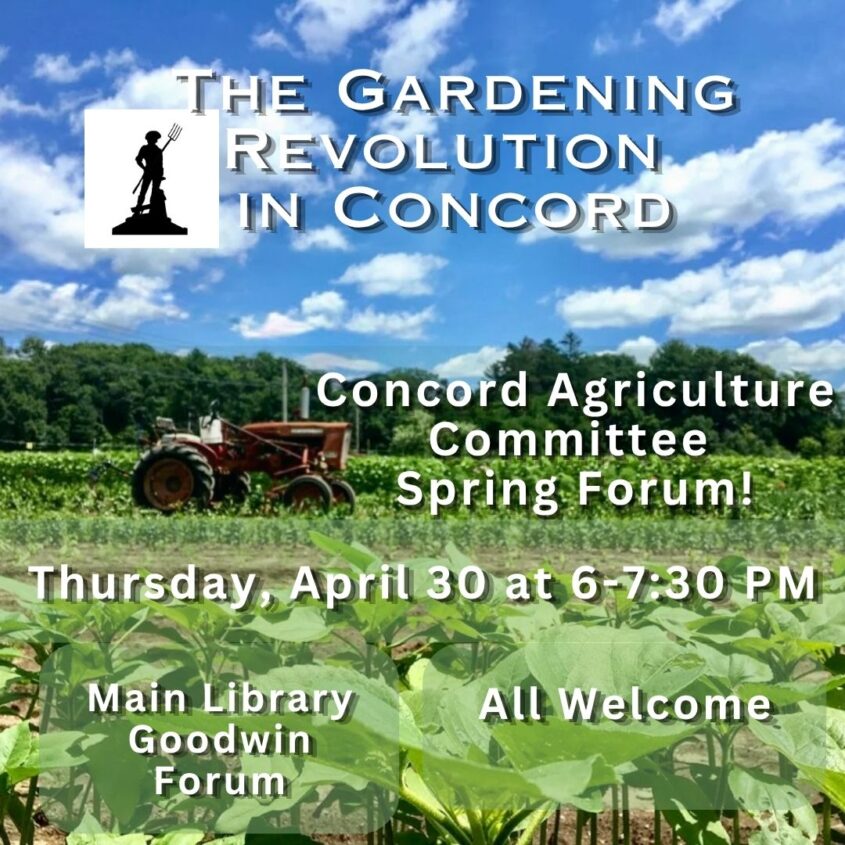 Hear American Historian, Professor Robert A. Gross, talk about the Gardening Revolution in Concord- an exploration of land, literature, and liberty, including accounts of the Minutemen and transcendentalists. Free and open to the public on Thursday April 30th from 6pm-7:30pm at the Concord Library (Main Branch) in the Goodwin Forum. Please join us for this special evening celebrating Concord’s rich agricultural history!