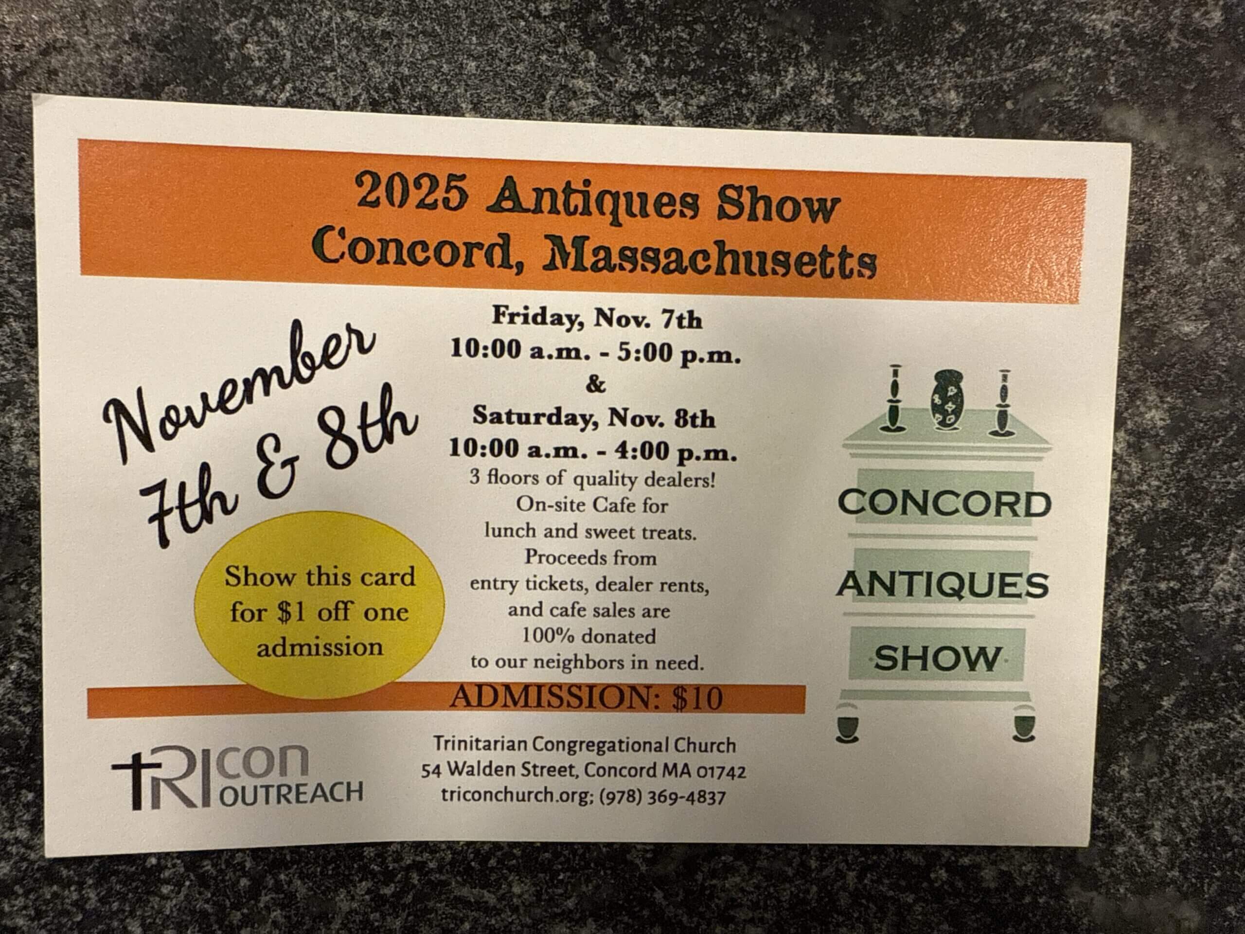Three floors of high-quality antiques dealers, and an on-site cafe for lunch and sweet treats. Join us November 7th & 8th. Doors open both days at 10:00 a.m. Closes at 5pm on Friday and 4pm on Saturday. 100% of the proceeds to the church (dealer rents, entry fees, cafe sales) goes towards our neighbors in need. $10 entry.