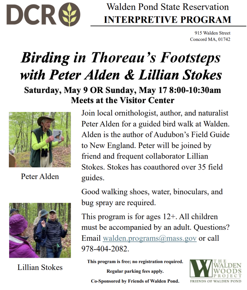Join local ornithologist, author, and naturalist Peter Alden for a guided bird walk at Walden Pond. These walks take place Saturday, May 9 OR Sunday, May 17, from 8:00-10:30am, and will meet at the Visitors Center.