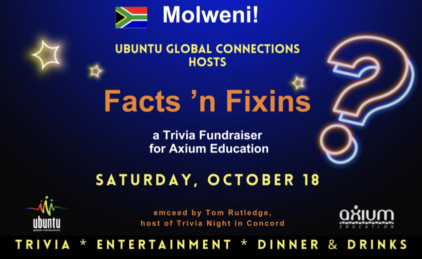 Join us at Ubuntu Global Connections for a special community trivia night fundraiser to benefit Axium Education, a South African nonprofit dedicated to improving rural education. The evening promises a lively atmosphere with a spirited trivia game, friendly team rivalry, prizes and fun team costumes. The event will be hosted by Tom Rutledge of Trivia Night in Concord and will include an array of delicious chilis with all the fixins, drinks, and musical entertainment. Attendees will also learn about Axium Education’s vital work in the Zithulele community in the Eastern Cape, where their programs have dramatically improved student achievement and increased graduation rates fivefold.