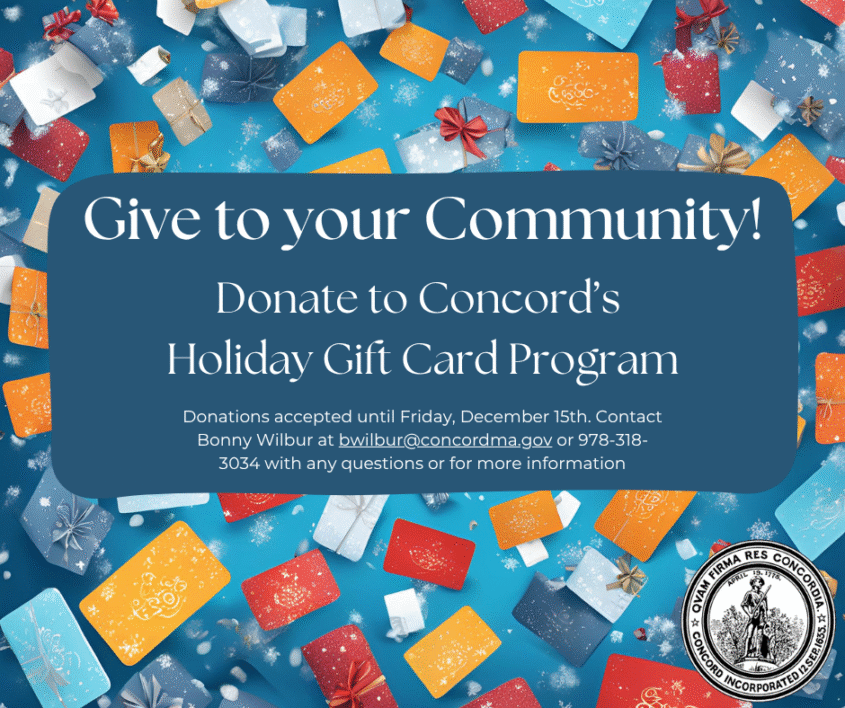 Concord’s Community Services Division invites you to donate a gift card to a local family in need this holiday season. Last year’s program provided financial support to over 115 children living in Concord. Gift card donations from any vendor are welcome! Some suggestions are local merchants, restaurants, pharmacies, or Amazon or VISA gift cards. Supermarket gift cards would be especially welcome this year.