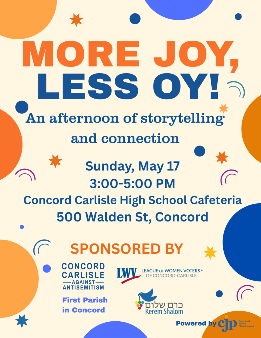 More Joy, Less Oy is back! Join us for an afternoon of connection, laughter, and storytelling. We will feature Moth-style true stories told live by members of the community that provide unique fragments of our daily experiences — heartfelt, funny, and drawn from the moments that stick with us.The theme of the event is traditions — the ones we inherit, the ones we create, and the ones that evolve over time. Come for the stories, and meet new people while you’re at it, as we celebrate the warmth, humor, and resilience woven through everyday life and friendship. Free. All are welcome.