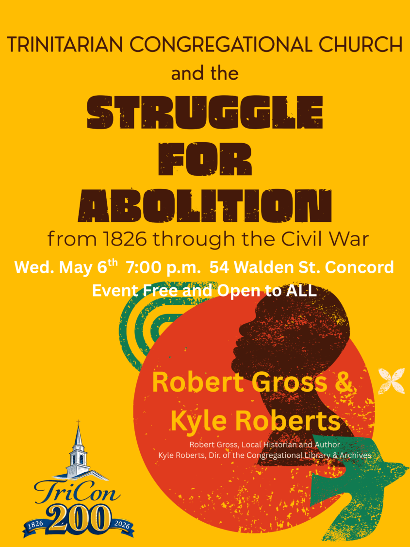 Trinitarian Congregational Church (TriCon) in Concord will host award-winning historian and author Robert A Gross in conversation with Kyle B Roberts, Executive Director of the Congregational Library & Archives in Boston. The two will discuss abolition in New England in the mid 1800s, with specific examples from the history of TriCon, its pastors, and parishioners in the early years of its founding. In 1826, as the First Church in Concord moved toward Unitarianism, nine members (including Maria, Elizabeth and Jane Thoreau, aunts of Henry David) joined others from the town to form what was to become Trinitarian Congregational Church. In this, our 200th year, TriCon commemorates its founding and shares some of its early history in this public program, which is free and open to all.
