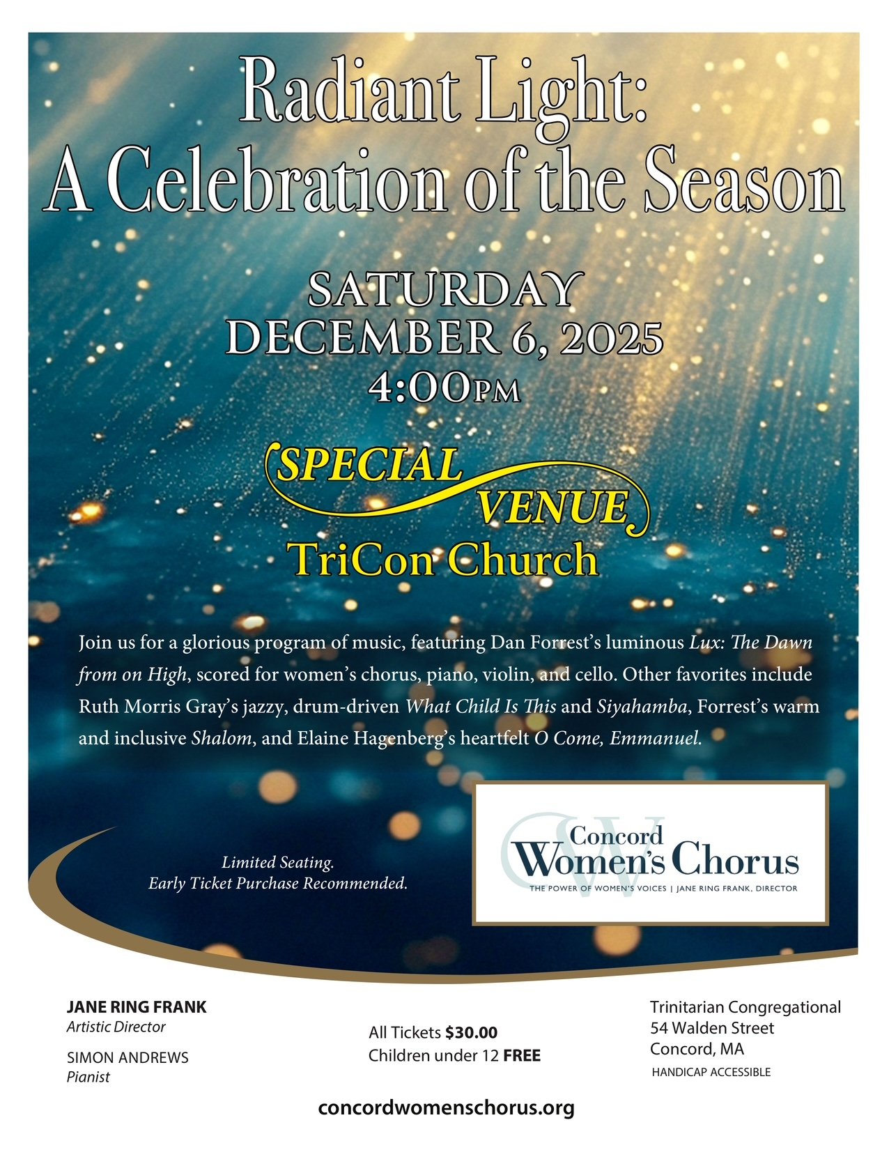 Winter Concerts: 2PM and 5PM Featuring works by Brahms, Gjeilo, Gounod, Palestrina, Still, Stainer & Vaughan Williams, and traditional carols with audience participation Saturday, December 13, 2025  at 2:00PM and 5:00PM Memorial Chapel, Middlesex School, 1400 Lowell Rd, Concord, MA Tickets are on sale!