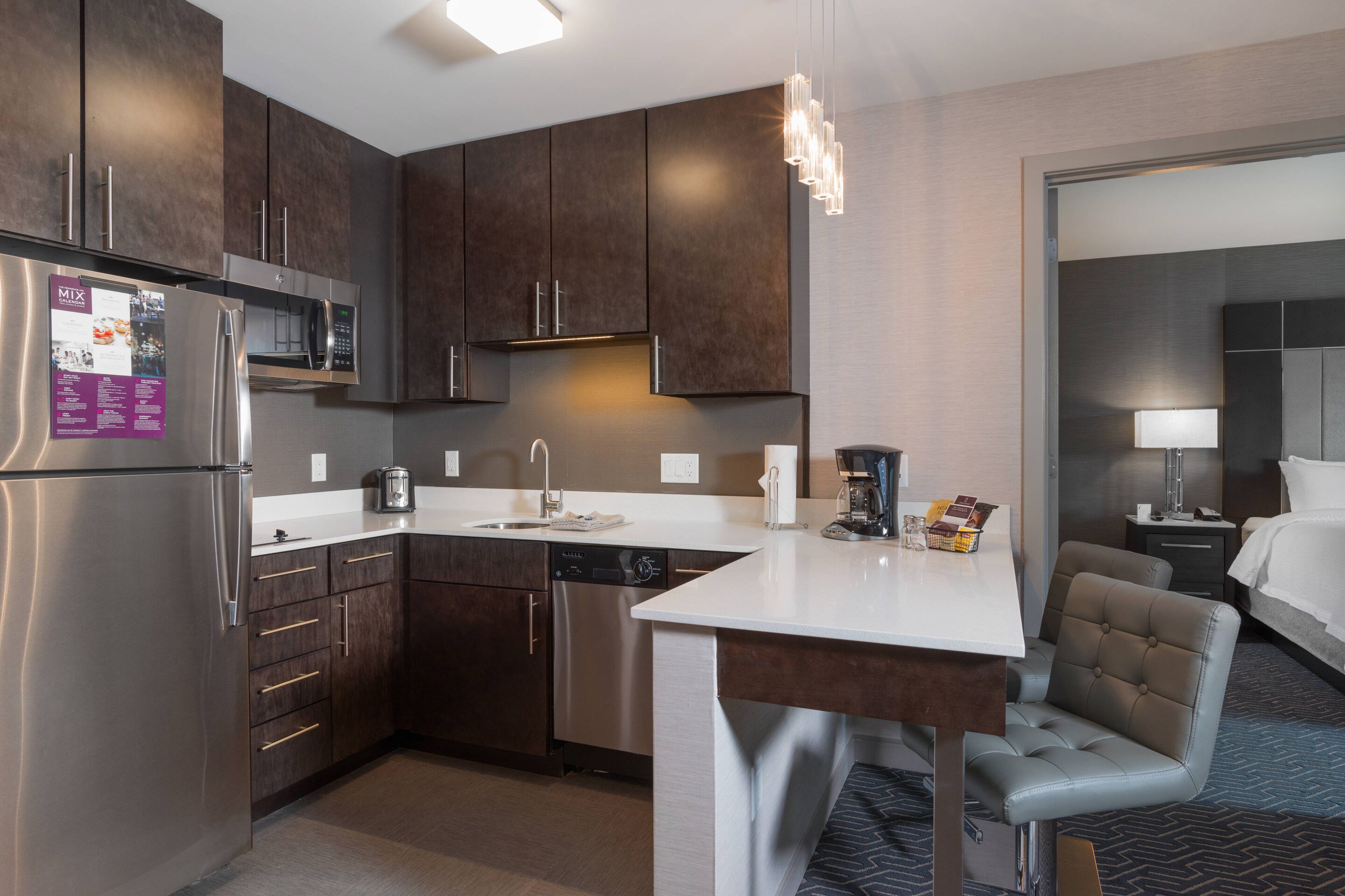 I was very impressed with the layout and modern design of the room which included a full kitchen and beautiful bath with walk-in shower. Our room was exceptionally clean and comfortable. The only problem was that we could only stay one night. The staff was very helpful, friendly and professional and the lobby/bar/breakfast area is nicely designed.